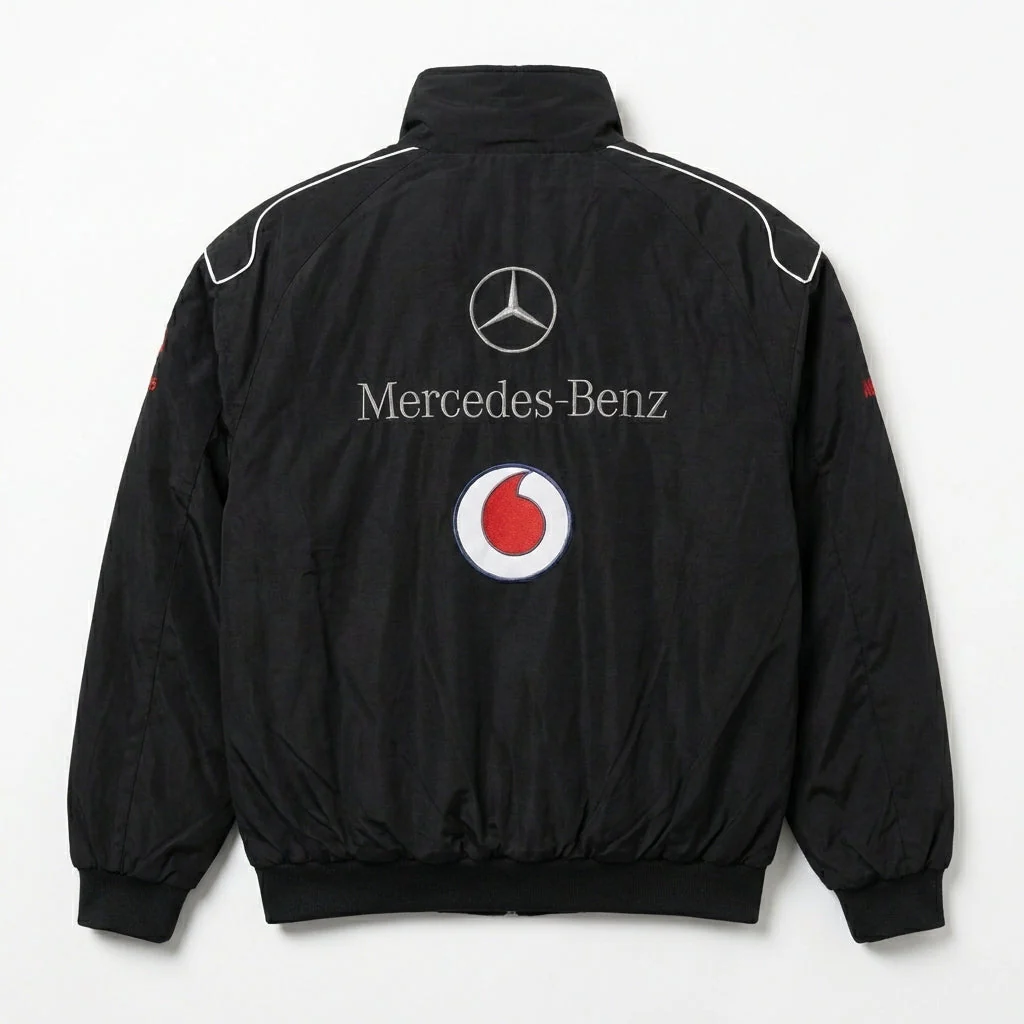 Add this black Mercedes-Benz racing jacket to your rotation for a sharp, track-ready look.