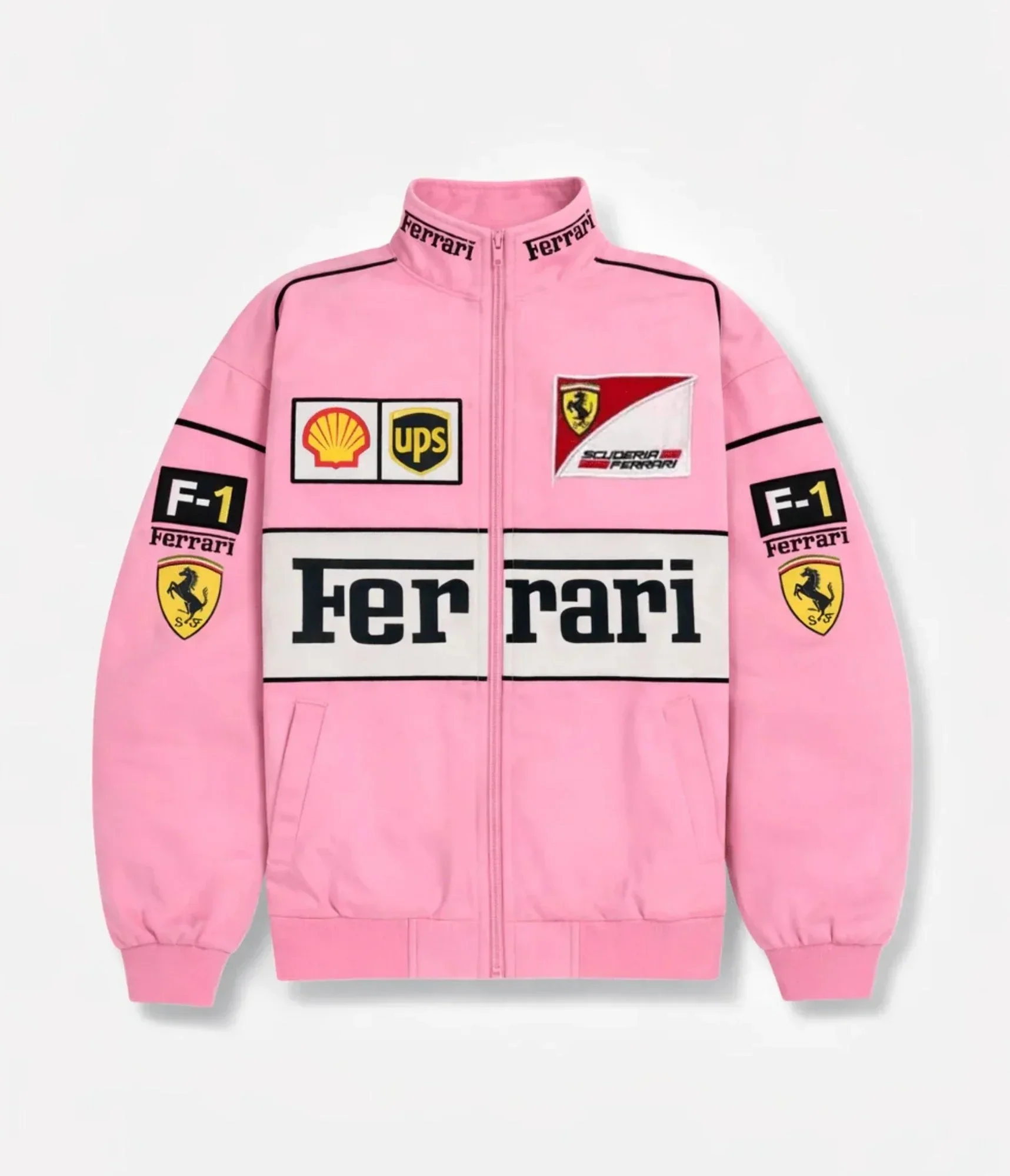 Stand out with the Ferrari F1 Vintage Racing Jacket â Pink Edition. This padded racing bomber combines iconic motorsport heritage with bold modern streetwear style. Featuring detailed embroidery and a premium construction made from high-quality cotton and polyester, it delivers both comfort and a striking look.