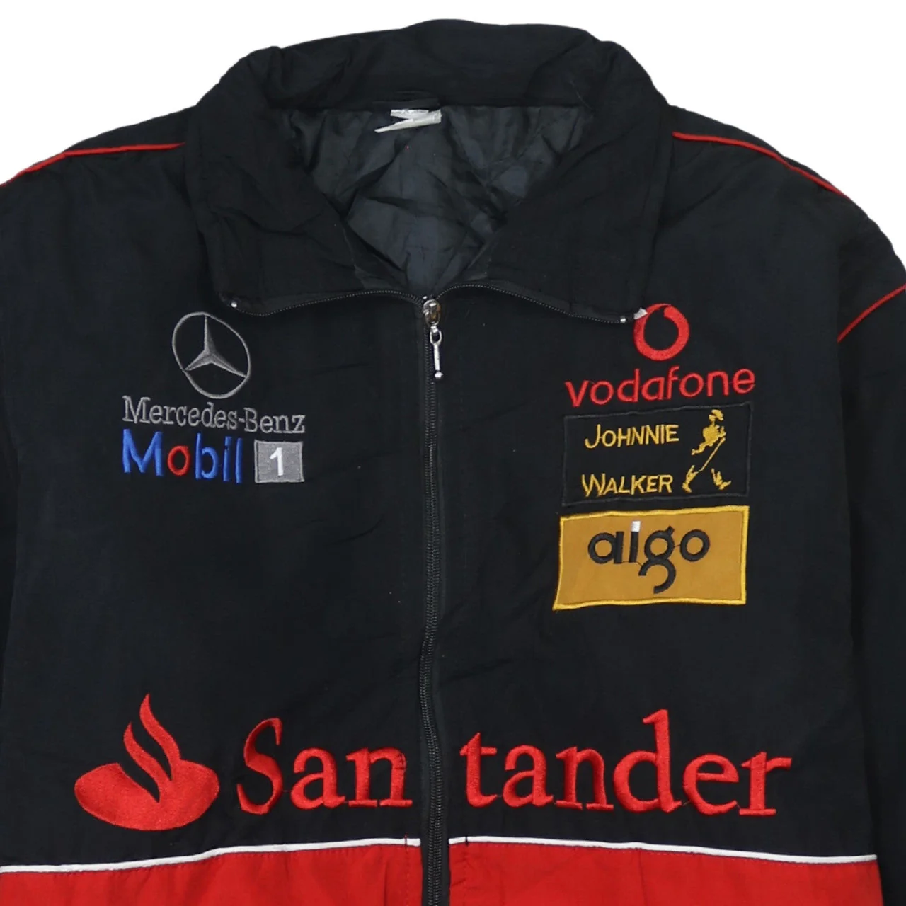 Mercedes-Benz jacket, Mercedes-Benz Nascar jacket, Mercedes-Benz racing jacket, McLaren Mercedes jacket, black red jacket, black red racing jacket, men's XLarge jacket, men's XL racing jacket, embroidered logo jacket, Santander logo jacket, Vodafone sponsor jacket, Mobil 1 logo jacket, Johnnie Walker logo jacket, Aigo sponsor jacket, SAP sponsor jacket, Nescafe sponsor jacket, Schuco sponsor jacket, motorsport jacket, Formula 1 jacket, F1 fan jacket, team jacket, pit crew style jacket, bomber jacket, quilted jacket, full zip jacket, long sleeve jacket, relaxed fit jacket, oversized fit jacket, casual outerwear, men's outerwear, track jacket style, collectible racing jacket, fan merchandise, black jacket, red jacket, colour block jacket, embroidered Mercedes logo, embroidered McLaren logo, ribbed cuffs jacket, elastic hem jacket, polyester wool jacket, lined jacket, classic motorsport style, men's casual jacket, everyday jacket, statement jacket, sponsor logo jacket